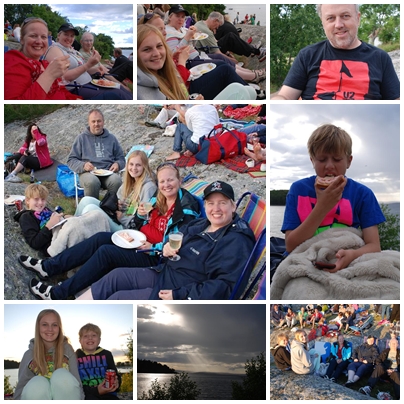 På kvelden dro vi til Tollerstranda på rekeaften, som alltid er vårt første arrangement på Larkolluka. Deilige reker, godt drikke, nydelig utsikt, musikk og masse mennesker sørget for god stemning og en fin kveld. Noen regndråper innimellom brydde vi oss ikke om. For Karoline var campingferien over for denne gang, hun ble med hjemover, og neste dag dro hun på hytteferie med venninner i Sandefjord.